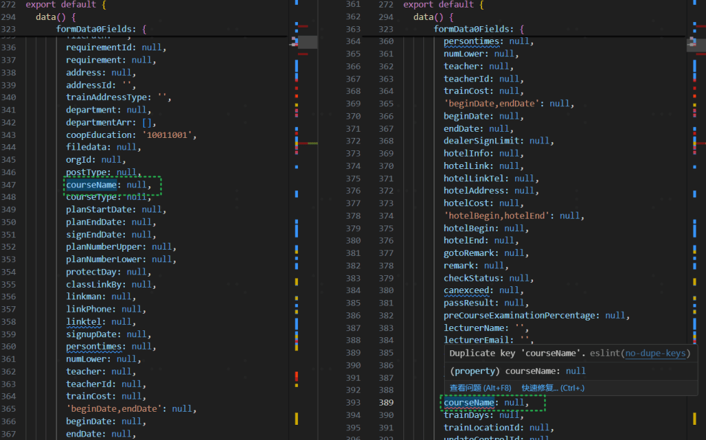 当表单有大量字段的时候,一不留神容易出现重复定义字段,可能会影响程序功能,ESlint能识别后波浪线显示