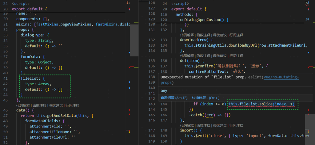 该错误是 Vue.js 项目中常见的 ESLint 规则警告,表示子组件直接修改了父组件传递的 fileList props,违反了 Vue 的单向数据流原则